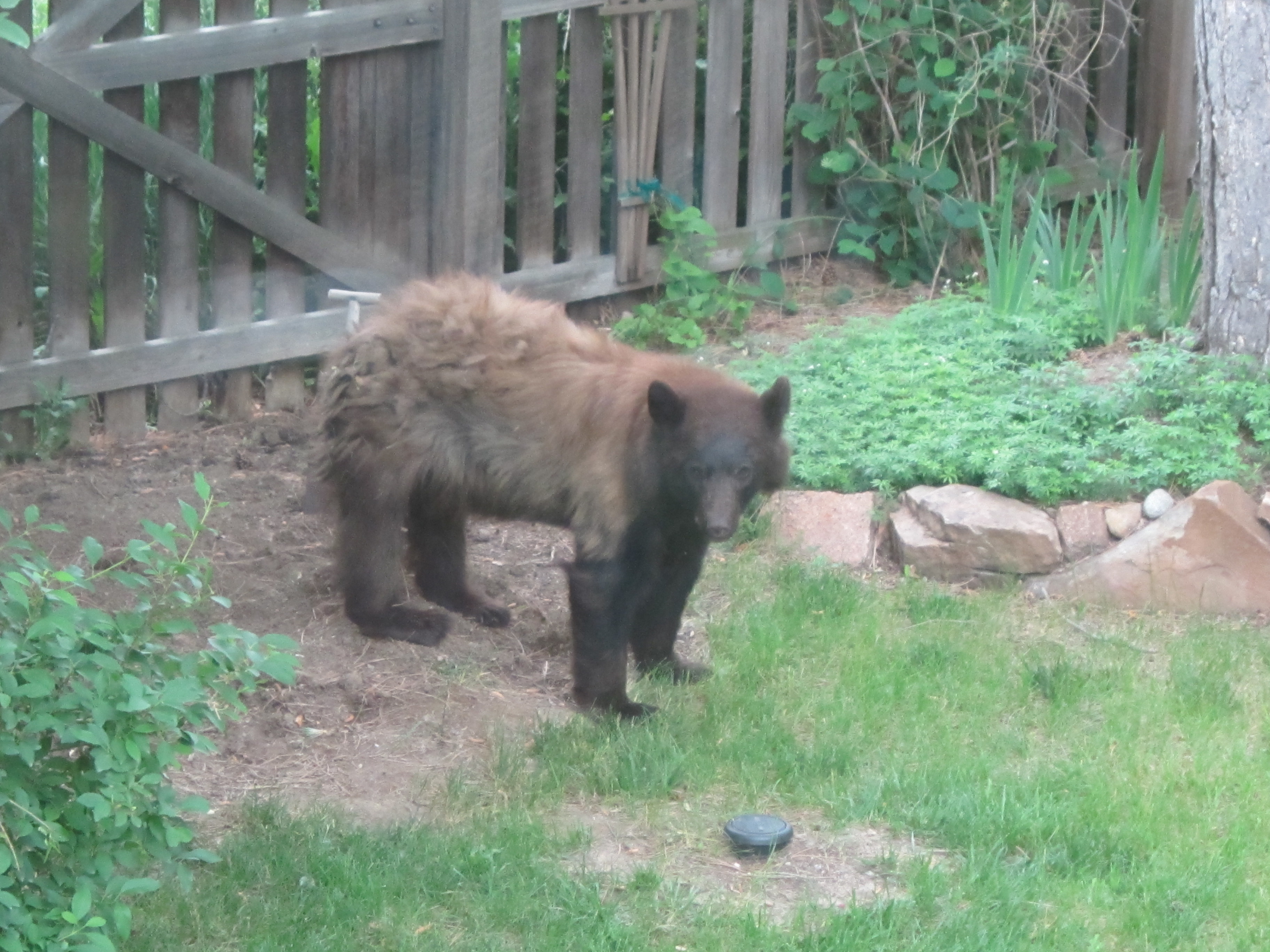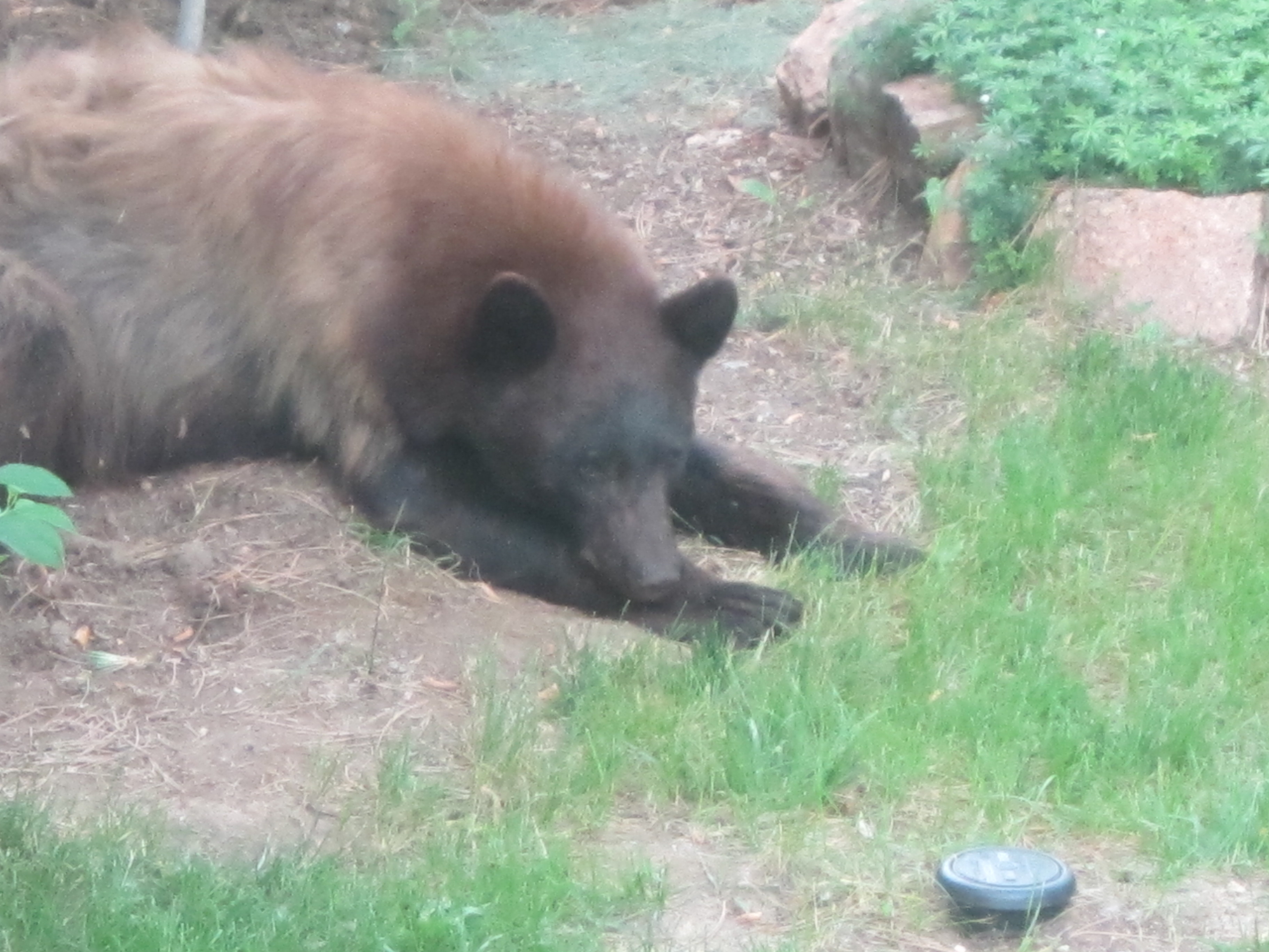 Just when I thought I was going to have a normal morning, my husband called us to the window to observe a bear in our backyard. After snacking on the breakfast buffet (our compost bin), he chewed on our hoses (to get a drink of water?), and then knocked over one of the potted plants to peer inside the sun room. Afterwards, he settled down for a nap. Good thing the wiener dogs were inside! Oh yeah, not a peep out of them. They’ll bark at every Tom, Dick, Harry and squirrel, but nooooo, not a bear! Guess that was good though. He would have snacked on them, too. Go figure! What a day!